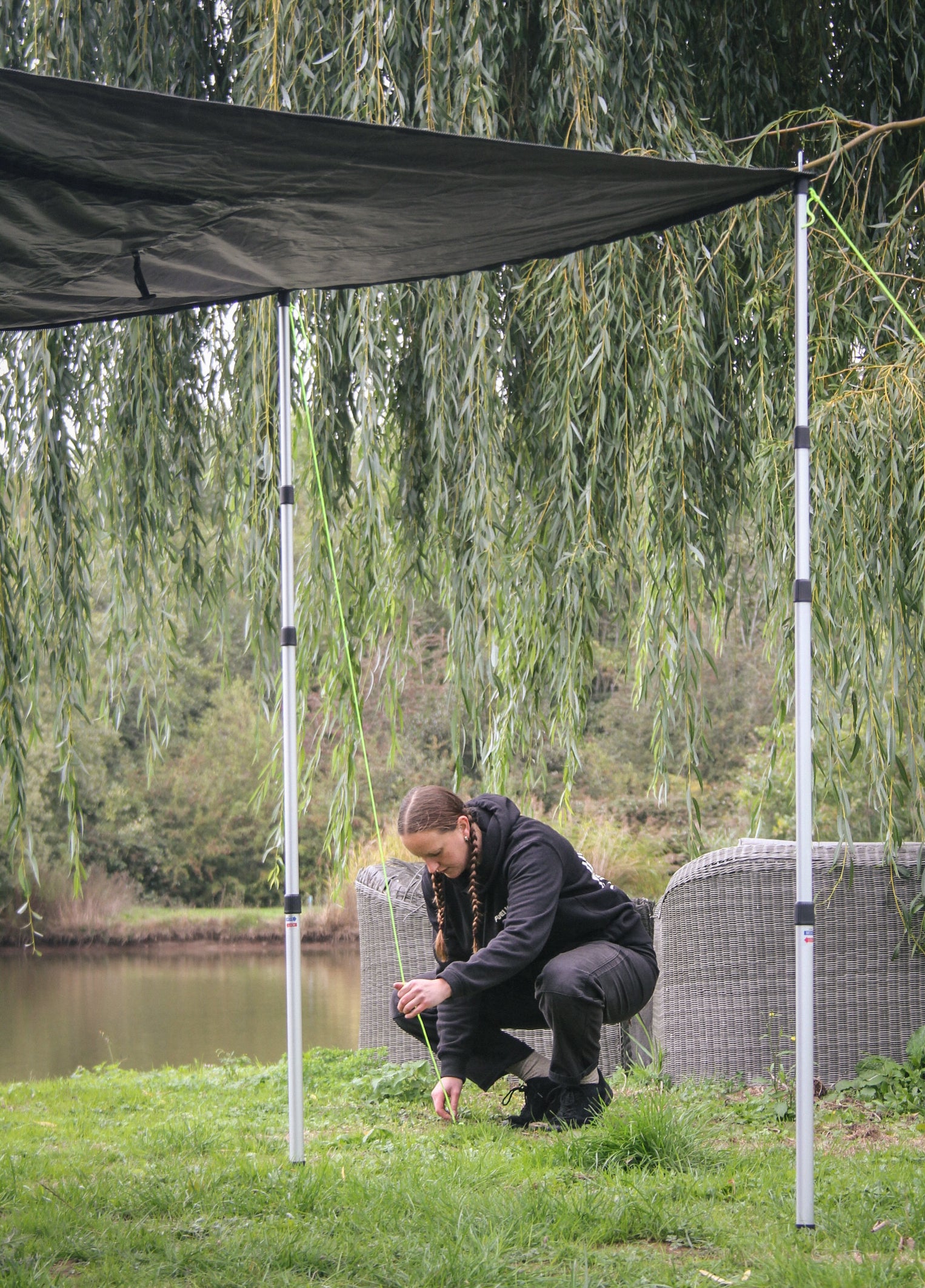 Simply pull over the top of the tailgate and peg down the floor. The door of the tent can be extended out as added shelter using the high quality telescopic poles to prop open the door.
